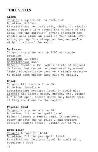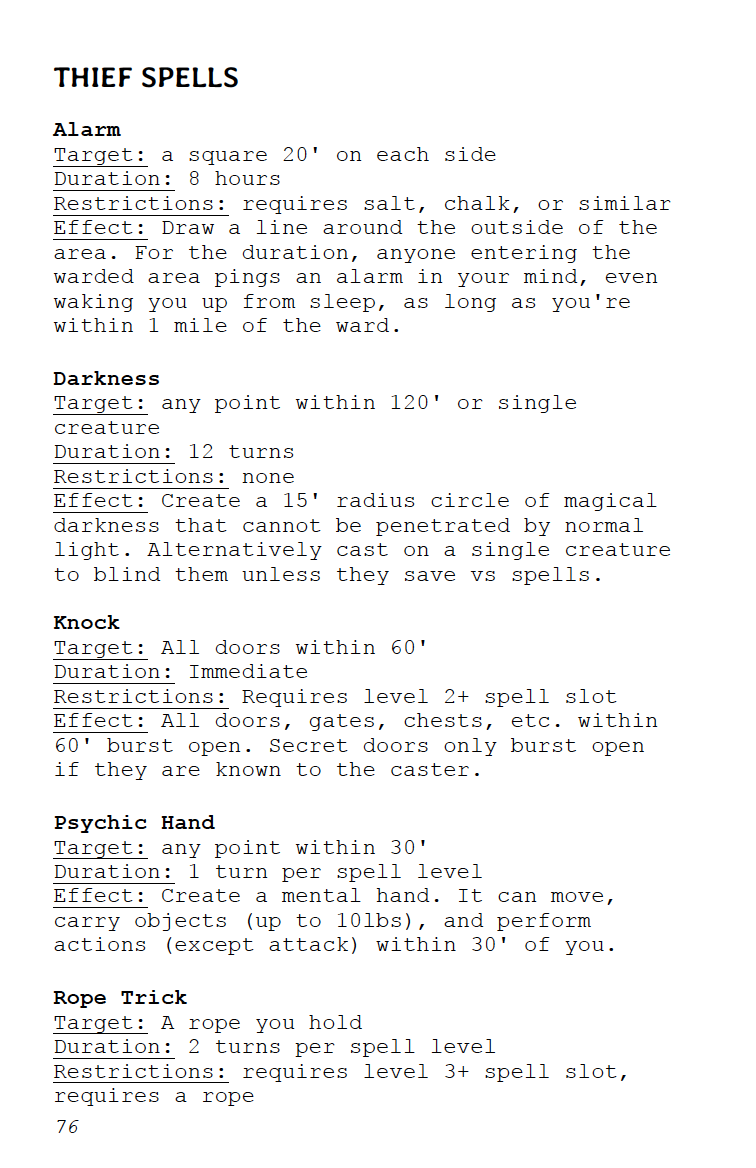 My favorite thing about this game is the base + topper class combinations. There are 50+ different classes possible when you combine the base and topper classes and it's fun to experiment with different options. You could be a Barbarian Magic-User, Greenwitch Dwarf, or Psychic Rogue. Every topper class has a unique set of spells, too!